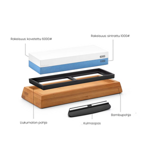Stålvass-hiomakivi toimii siten, että liotat kiven muutaman minuutin ajan, jotta saat tasaisen hiontapinnan. Aseta sitten kivi bambukehykseen vakauden takaamiseksi. Kiinnitä kulmaohjain veitsen päälle varmistaaksesi oikean hiontakulman. Vedä veistä edestakaisin kiven yli, kunnes saavutat halutun terävyyden.