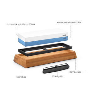 Mästerkockspaketet innehåller en 22 cm kockkniv, slipsten, vinkelguide, bambuhållare och korrektionssten – allt du behöver för sylvassa resultat i köket.